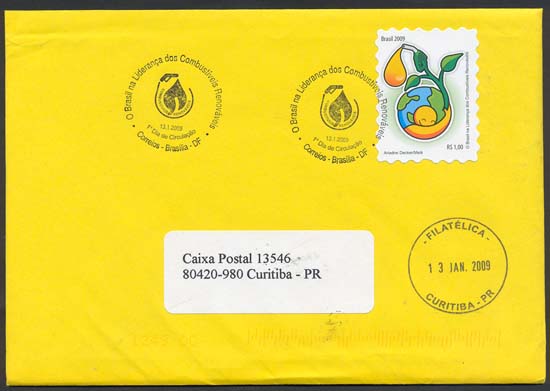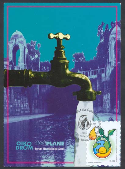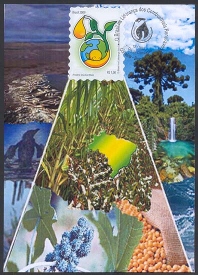 O selo e o carimbo comemorativo ilustram: meio ambiente, sustentabilidade, recursos econômicos, flora, tecnologia, invenções, geografia.