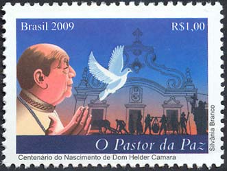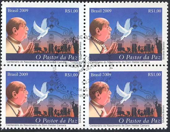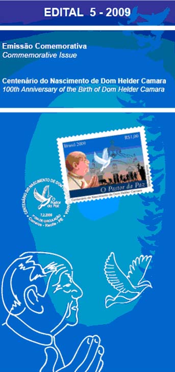 À esquerda, a imagem de Dom Helder Camara soltando uma pomba branca, símbolo universal da paz. Ao lado, em tamanho menor, a imagem de agricultores representando alguns dos importantes movimentos sociais dos quais participou, como a Pastoral da Terra, Pastoral do Negro e Pastoral do Índio. Ao fundo, a imagem rebaixada da Igreja das Fronteiras, local em que viveu até sua morte, e que hoje abriga o Instituto Dom Helder Camara. Complementando o selo, um fundo azul e alaranjado, simbolizando o alvorecer de um novo tempo. Foram utilizadas técnicas de ilustração vetorial e computação gráfica.