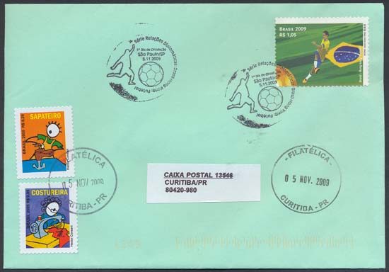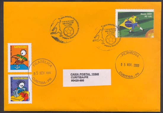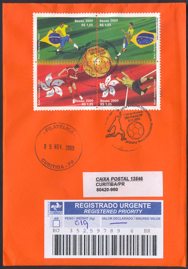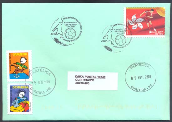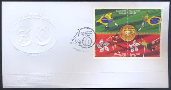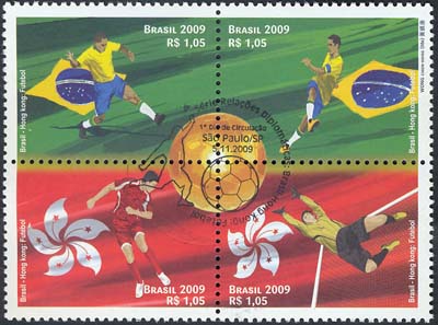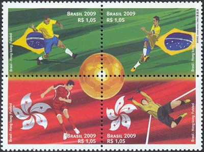 Os selos retratam o futebol, e suas duas forças motrizes – os jogadores, e seu instrumento de trabalho: a bola. Ao centro da quadra, ela aparece dourada, como um troféu, a mola mestra e razão de ser desse esporte. Os selos mostram quatro atletas em ação, tendo, ao fundo, nos selos de cima, o verde, cor dominante na bandeira do Brasil, e, abaixo, o vermelho, dominante na bandeira de Hong Kong. Eles homenageiam, respectivamente, o futebol brasileiro e o futebol do extremo oriente. Foram utilizadas as técnicas de desenho vetorial e computação gráfica.