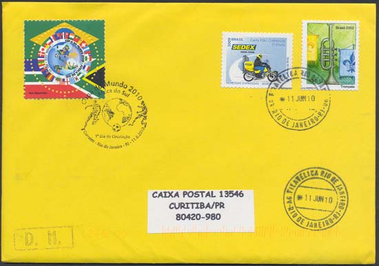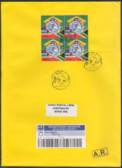 12 - Série Copa do Mundo 2010 - África do Sul - Envelope registrado, circulado, com aviso de recebimento e com carimbo de 1º dia de circulação