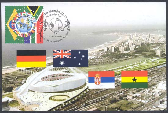 Postal de emissão de Edição Schmittstamps 2010, Copa do Mundo 2010 - África do Sul, Grupo D, Alemanha, Austrália, Sérvia, Gana, Estádio Moses Mabhida - Durban