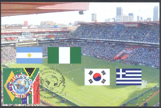 Postal de emissão de Edição Schmittstamps 2010, Copa do Mundo 2010 - África do Sul, Grupo B, Argentina, Nigéria, Coreia do Sul, Crécia, Estádio Ellis Park - Joanesburgo