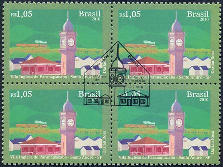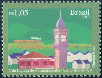 O selo mostra uma locomotiva a vapor em movimento, conhecida pela população brasileira como Maria Fumaça. Sobre fundo na cor verde, a Mata Atlântica da Serra do Mar e uma vista parcial da Vila Inglesa de Paranapiacaba, localizada no interior do município de Santo André, no Estado de São Paulo, com suas casas e alojamentos em estilo inglês. É mostrada, ainda, em destaque, a torre de tijolos maciços com sua peculiar cúpula e o característico relógio londrino da estação ferroviária, que confere uma atmosfera britânica ao local. O conjunto de edificações e o entroncamento ferroviário ali existente é um dos mais significativos exemplos da arquitetura e da engenharia ferroviária inglesa de fins do século XIX. A estação ferroviária, atualmente, é um dos ícones do turismo local. Foram utilizadas as técnicas de desenho e computação gráfica.