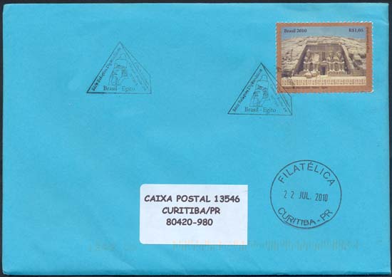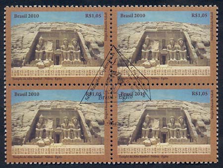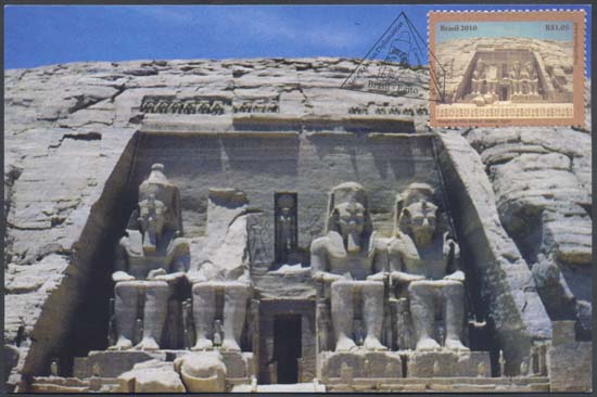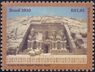 O selo reproduz a fachada principal do magnífico Templo de Ramsés II, que integra o complexo de Templos de Abu Simbel (com 33 metros de altura e 38 de largura),constituída por quatro estátuas de Ramsés II, ostentando a coroa dupla da unificação entre o Alto e o Baixo Egito. A segunda estátua foi parcialmente destruída por um terremoto em 27 a.C., encontrando-se,a cabeça e o tronco, próximos à entrada do templo. Entre as pernas das estátuas maiores há estatuetas que simbolizam alguns familiares desse grande soberano egípcio. Na parte inferior do selo são apresentadas inscrições em hieróglifos, sinais da escrita usada, entre outras civilizações, também no Antigo Egito. A imagem evoca, por meio de suas grandiosas formas arquitetônicas, a solidez e opulência do tempo dos faraós. Foram utilizadas as técnicas de fotografia e computação gráfica.