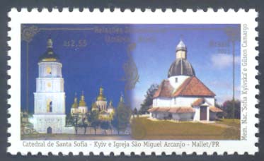 O selo divulga duas igrejas Cristãs Ucranianas, uma na cidade de Kyiv, Ucrânia, e outra na colônia ucraniana brasileira, na cidade de Mallet, no estado do Paraná. À esquerda, visualiza-se a Catedral de Santa Sofia, com suas cúpulas douradas, de arquitetura bizantina, o primeiro monumento ucraniano inscrito na Lista de Patrimônio Mundial da UNESCO. À frente, destaca-se o suntuoso Campanário da Catedral com quatro andares. À direita, a Igreja de São Miguel Arcanjo, a primeira construída no Brasil por imigrantes ucranianos; as paredes são triplas, onde a madeira foi encaixada com pouco uso de pregos, trata-se de um bem histórico, cultural e patrimonial O contraste das cores, ao fundo, no selo, retratando a noite e o dia, expressa, no conjunto, o relacionamento, a integração e o respeito entre os dois países. A criação das molduras usadas como acabamento foi inspirada na cultura ucraniana, bem como usado um grafismo decorativo como ornamento do selo, lembrando os bordados, xilogravuras e os tradicionais ovos pêssanka ucranianos. Foram utilizadas as técnicas de desenho gráfico e fotografias.