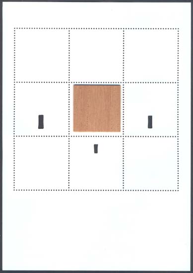 Devido à caracterista inusitada da vinheta central, que possui em seu verso uma lâmina de madeira, coloco também a imagem do verso da mini-folha. As marcas na cor preta que aparecem correspndem às aberturas existentes em três dos selos.
