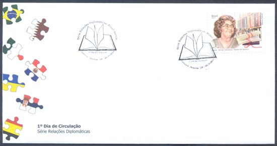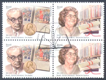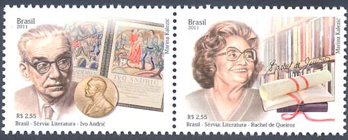 25 - Emissão Conjunta - Série Relações Diplomáticas: Brasil-SérviaOs selos retratam os dois autores homenageados. No primeiro, tem-se a imagem da autora Rachel de Queiroz. No canto inferior direito, encontram-se a representação da assinatura da autora e um diploma em referência ao Prêmio Camões, destinado a autores de língua portuguesa, recebido por Rachel em 1993. Abaixo do diploma, duas obras sobrepostas, e, ao fundo, uma estante de livros, destacando sua vida literária. O segundo selo focaliza o escritor sérvio Ivo Andric´. Na peça também estão reproduzidos a medalha e o diploma recebidos pelo autor na ocasião do Prêmio Nobel de Literatura, em 1961. Foi utilizada a técnica de computação gráfica e fotografia.