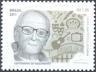 Na composição da imagem do selo, que tem como fundo a cor branca, encontra-se a representação da expressão do artista Mário Lago, ainda viva na lembrança do público, como elemento principal. Ao lado, uma composição feita a partir de ícones como caneta tinteiro, máscaras, televisão, violão, película cinematográfica com a inscrição do nome do artista, e outros, que representam a sua intensa atividade cultural, como a literatura, o teatro, a televisão, o rádio e o cinema. O bairro da Lapa, onde Mário Lago nasceu e iniciou sua carreira, também está reproduzido na parte inferior da composição, por meio de seus famosos arcos. No canto inferior direito, a logomarca do Mercosul, por tratar-se de uma emissão comum aos seus países membros. Foram utilizadas as técnicas de retícula estocástica em tons de cinza e calcografia nas cores preto e dourado.
