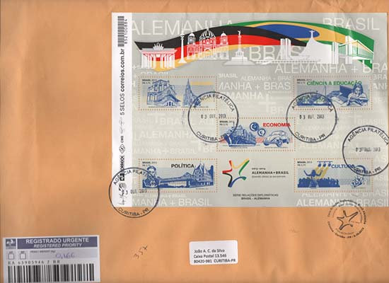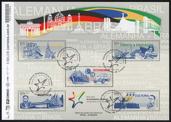 A parte superior da minifolha, com cinco selos, apresenta uma faixa com as bandeiras do Brasil e da Alemanha entrelaçadas, formando um painel ilustrado com ícones arquitetônicos dos dois países. Na parte inferior, ao centro, destaca-se a marca da Temporada da Alemanha no Brasil e o lema “Quando ideias se encontram”. Ao fundo, em gradações de cor cinza, foi aplicada a frase “Alemanha + Brasil”. Cada um dos cinco selos representa um pilar da parceria entre os dois países. Turismo foi representado pela arquitetura germânica localizada em Curitiba/PR e em Canela/RS; Ciência & Educação pelo apoio alemão aos projetos de tecnologia e de educação; Economia pelo navio cargueiro, alusivo ao comércio bilateral, e o automóvel, que remete à indústria automobilística estabelecida no País, com as engrenagens simbolizando as indústrias alemãs que aqui se instalaram; Política pela imigração alemã, com a figura de Hermann Blumenau, e ícones da cidade por ele fundada, a Ponte de Ferro e uma construção em estilo enxaimel; Cultura pelo dramaturgo Bertolt Brecht, que influenciou textos e montagens teatrais nacionais. No fundo de cada selo, há um painel de microletras com a inscrição “Alemanha + Brasil”. Foram utilizadas as técnicas de desenho e computação gráfica.