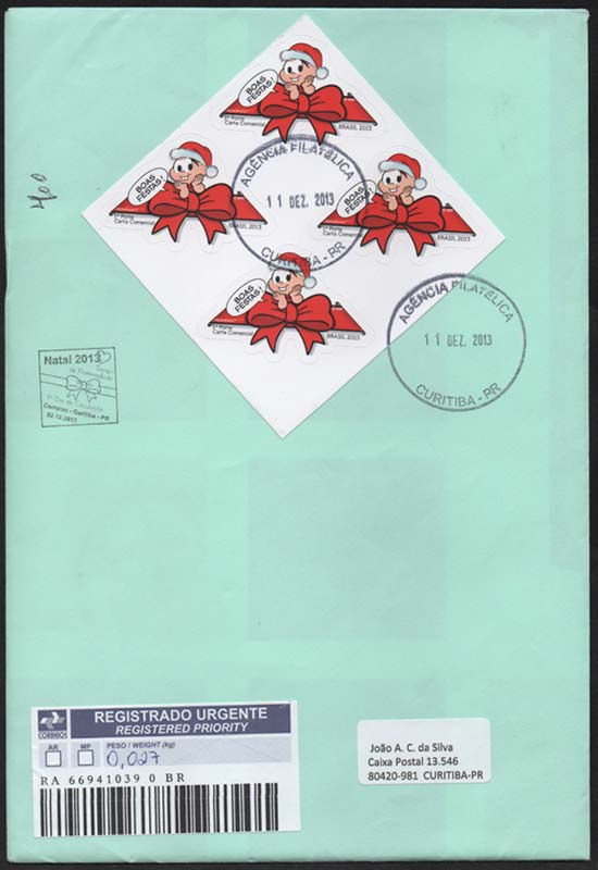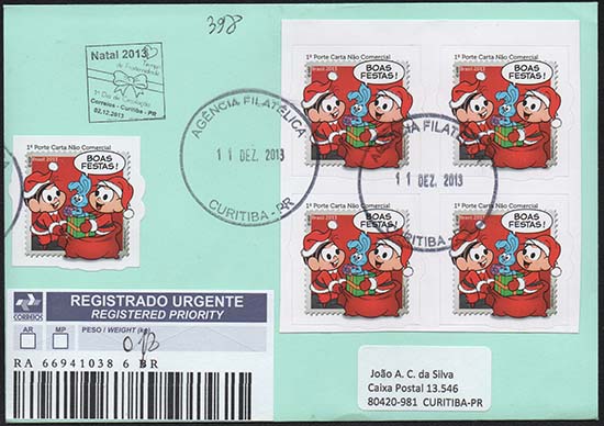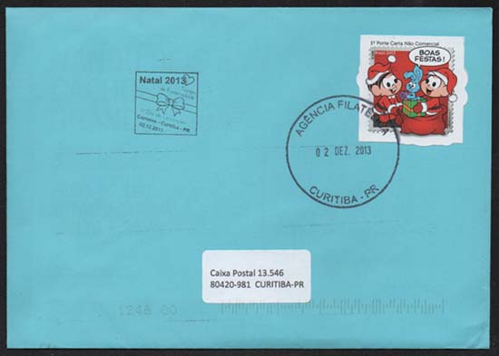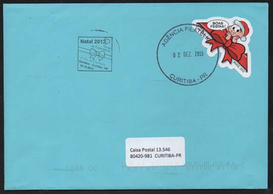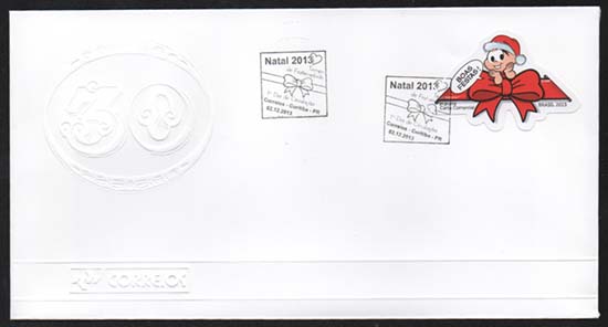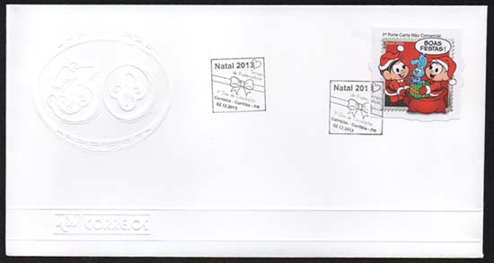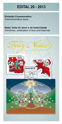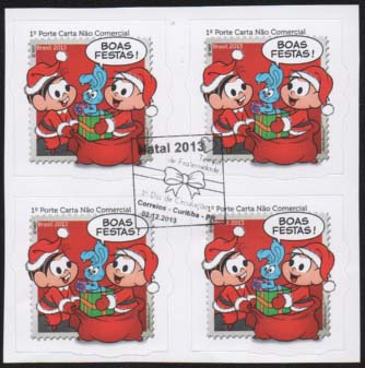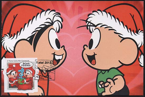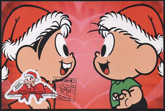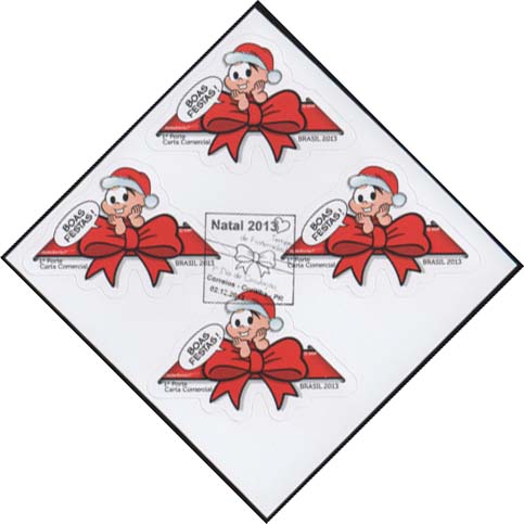 Edital nº 20 Artes: Mauricio de Sousa Processo de Impressão: ofsete Folha: Mônica e Cebolinha: 30 selos Lacinho: 30 selos Papel: cuchê autoadesivo Valor facial: Mônica e Cebolinha: 1º Porte Carta Não Comercial Lacinho: 1º Porte Carta Comercial Tiragem: Mônica e Cebolinha: 1.500.000 selos Lacinho: 2.250.000 selos Área de desenho: 33mm x 33mm Dimensão do selo: 38mm x 38mm (formato diferenciado) Picotagem: semi-corte Data de emissão: 2/12/2013 Locais de lançamento: em todas as DR's Impressão: Casa da Moeda do Brasil Prazo de comercialização pela ECT: até 31 de dezembro de 2016 (este prazo não será considerado quando o selo bloco for comercializado como parte integrante das coleções anuais, cartelas temáticas ou quando destinado para fins de elaboração de material promocional)