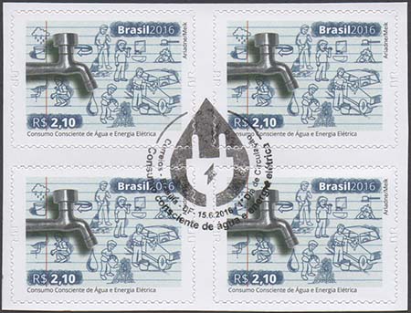Os selos apresentam desenhos de cenas que objetivam a racionalização do consumo de água e energia elétrica, ou seja, o consumo consciente desses recursos. O primeiro selo apresenta a foto de uma torneira, como um símbolo do consumo de água. Uma seta indica o movimento que deve ser feito para fechá-la. Outros desenhos feitos com caneta esferográfica, representam dicas de redução do consumo de água: aproveitamento da água da chuva, varrer o pátio ao invés de lavá-lo, escovar os dentes com a torneira fechada, ensaboar-se com o chuveiro fechado, consertar vazamentos, lavar veículos e regar plantas sem usar mangueira. O segundo selo mostra, ao centro, uma lâmpada, como símbolo do consumo de eletricidade e, ao fundo, o desenho do sol, fonte maior de luz. Os demais desenhos sugerem dicas importantes: apagar as luzes em ambientes vazios, usar eletrodomésticos mais econômicos, usar o chuveiro elétrico na posição VERÃO ou equivalente e desplugar, sempre que possível, aparelhos elétricos das tomadas, evitando a posição de espera, o stand by, remetendo à otimização da economia de energia elétrica. Foram utilizadas fotografias e a técnica de ilustração, arte-finalizada com uso de computação gráfica..