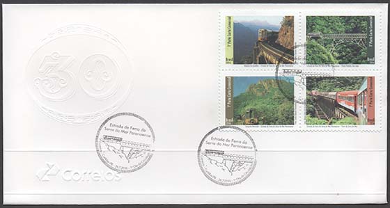 Os selos são fotografias de quatro significativos pontos percorridos na Ferrovia Paranaguá-Curitiba, no Estado do Paraná, uma formidável obra de engenharia construída no sul do Brasil, e, especialmente pelo visual e beleza singelamente espetaculares, de onde se vislumbram e descortinam panoramas deslumbrantes da imponente serra do mar e seu relevo acidentado, do verde pujante da Mata Atlântica preservada e do bucólico litoral paranaense, emoldurados pelo sol, pelo céu azul, e, eventualmente, por nuvens e neblina. Uma paisagem inesquecível, preservada, e que congrega, em toda plenitude, os elementos da natureza, a pureza da atmosfera, da terra e da floresta úmida. Foram usadas as técnicas de fotografia e computação gráfica.