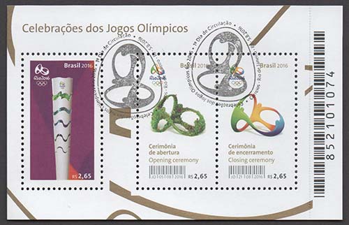 Encerrando a série de selos comemorativos dos Jogos Olímpicos Rio 2016, os Correios lançam uma emissão especial com o tema “Celebrações dos Jogos Olímpicos”, que destaca três importantes elementos dos primeiros Jogos da América do Sul: a tocha Olímpica e os ingressos das cerimônias de abertura e encerramento.