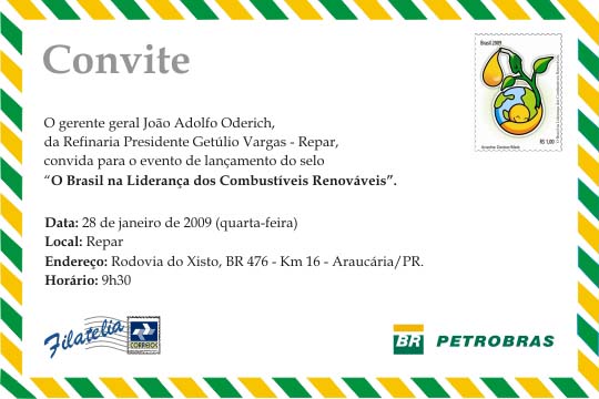 Acabo de receber o convite para a cerimônia de lançamento do selo sobre biocombustivel,que acontecerá no próximo dia 28, às 09:30 horas, na sede da REPAR, em Araucária.