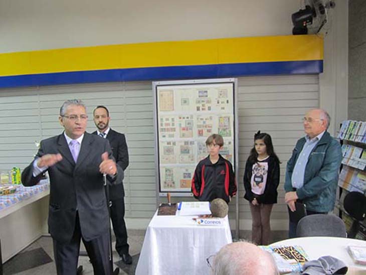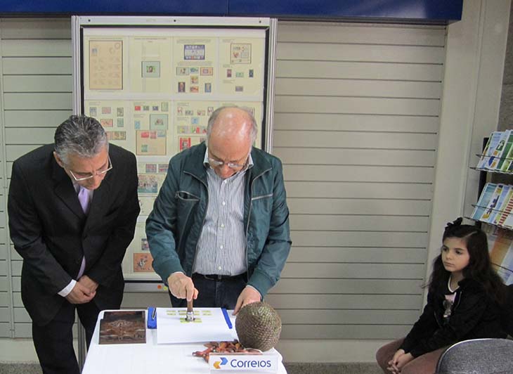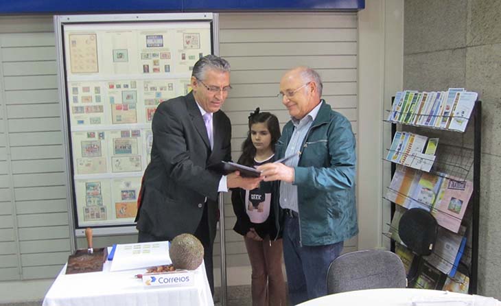 A peça filatélica obliterada é exibida aos presentes à cerimônia